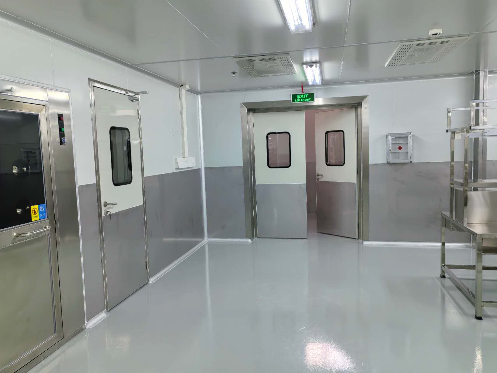 在建筑用材与施工工艺方面,项目秉持高标准、高质量的原则。车间内部隔墙与吊顶板均采用机制中空玻镁彩钢板,该材料具有强度高、防火性能优异、隔音隔热效果好、表面平整光滑不易积尘等优点,非常适合净化车间环境。所有门体和车间墙体均在表面贴附了1.2米高的不锈钢防护板,既增强了门和墙板的耐用性与抗冲击能力,也便于清洁维护,体现了细节处的匠心考量。